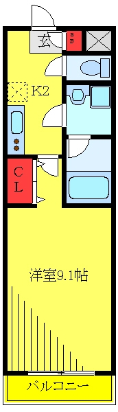 K 2 畳 1 階 1 室 洋室 9.1 畳 1 階 1 室 |