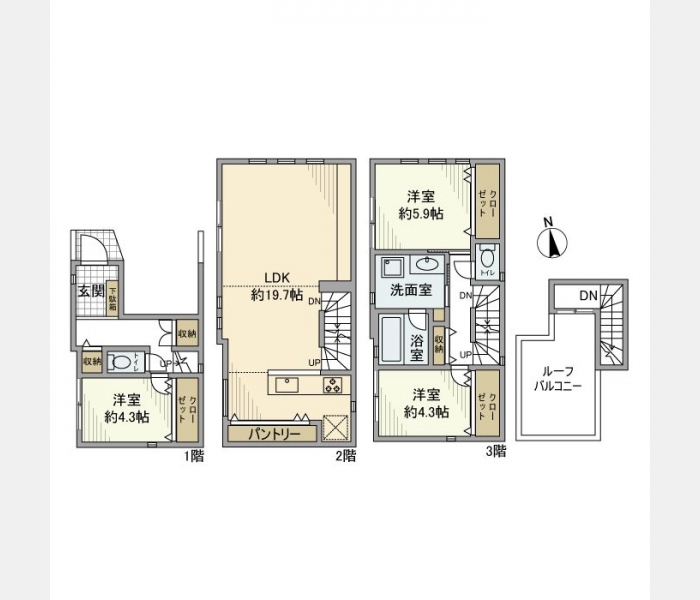 LDK 19.7 畳 1 室 洋室 5.9 畳 1 室 洋室 4.3 畳 2 室 |