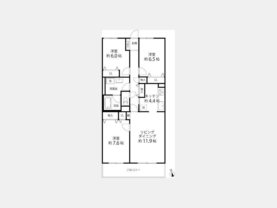 洋室 6.5 畳 洋室 6 畳 洋室 7.6 畳 LDK 11.9 畳 |