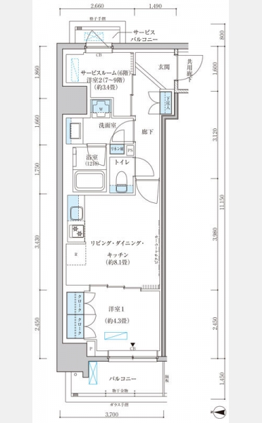 洋室 4.3 畳 LDK 8.1 畳 S 3.4 畳 |