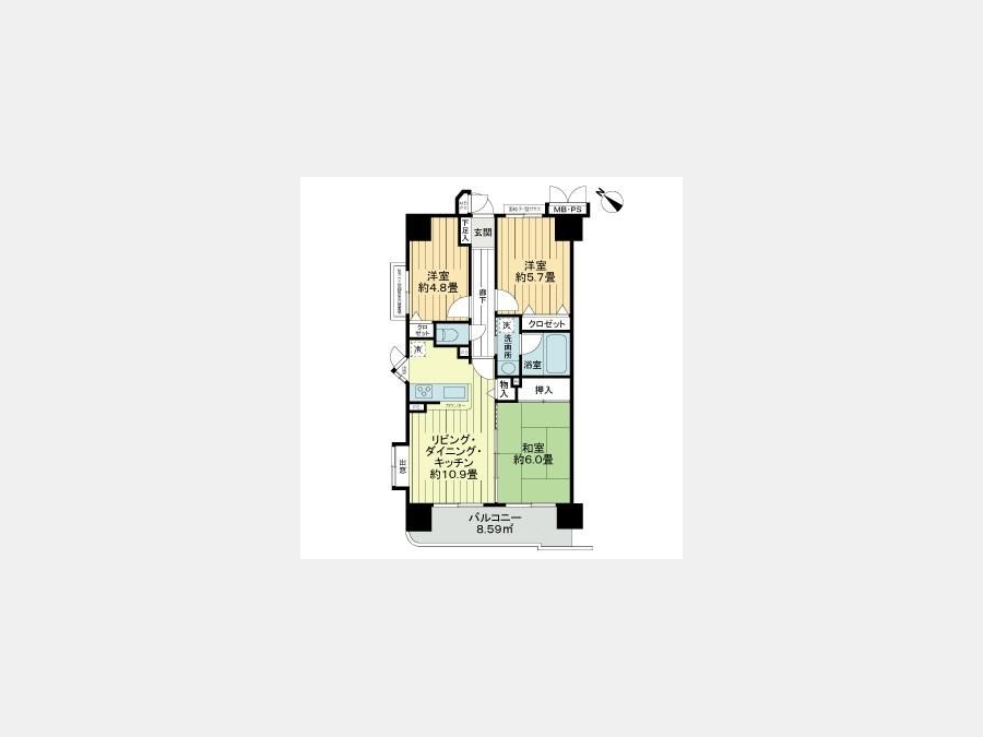 LDK 10.9 畳 和室 6 畳 洋室 5.7 畳 洋室 4.8 畳 |