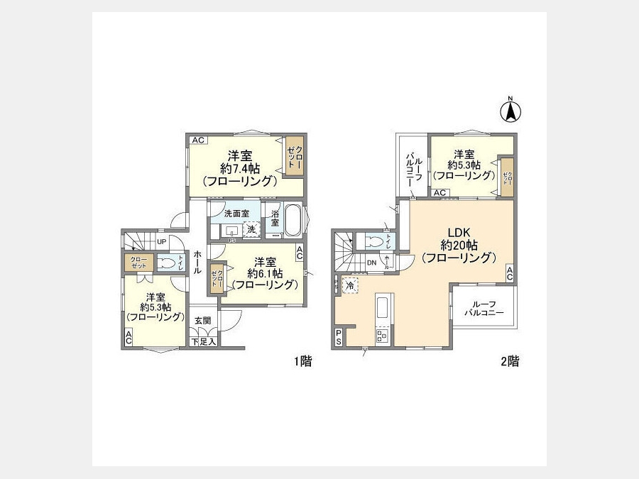 LDK 20 畳 洋室 7.4 畳 洋室 6.1 畳 洋室 5.3 畳 洋室 5.3 畳 |