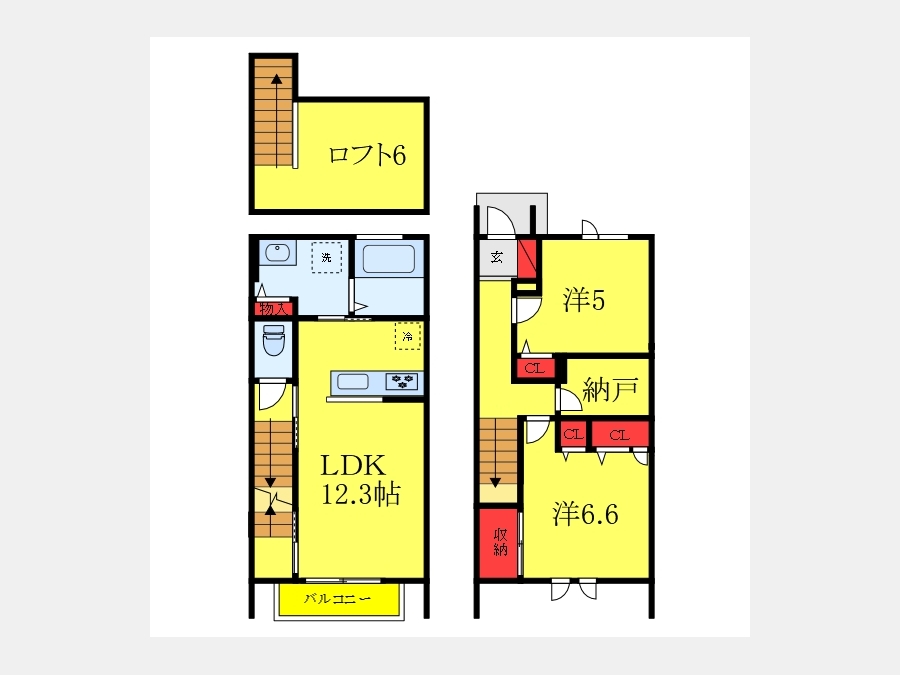 洋室 6.6 畳 洋室 5 畳 LDK 12.3 畳 S 2.2 畳 ロフト6帖 |