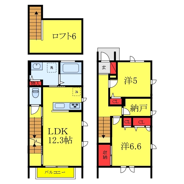 洋室 6.6 畳 洋室 5 畳 LDK 12.3 畳 S 2.2 畳 ロフト6帖 |