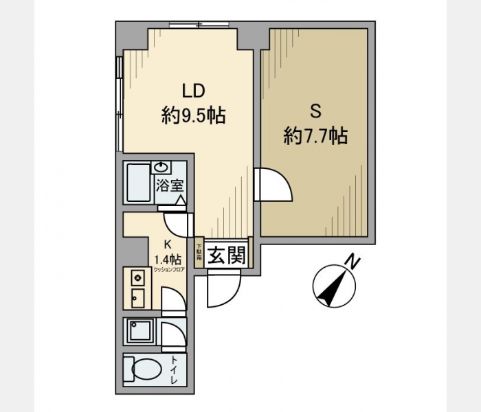 洋室 7.7 畳 1 室 LD 9.5 畳 1 室 K 1.4 畳 1 室 |