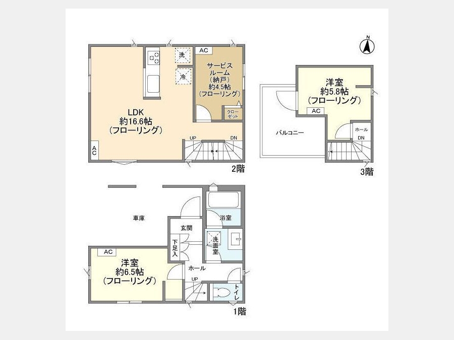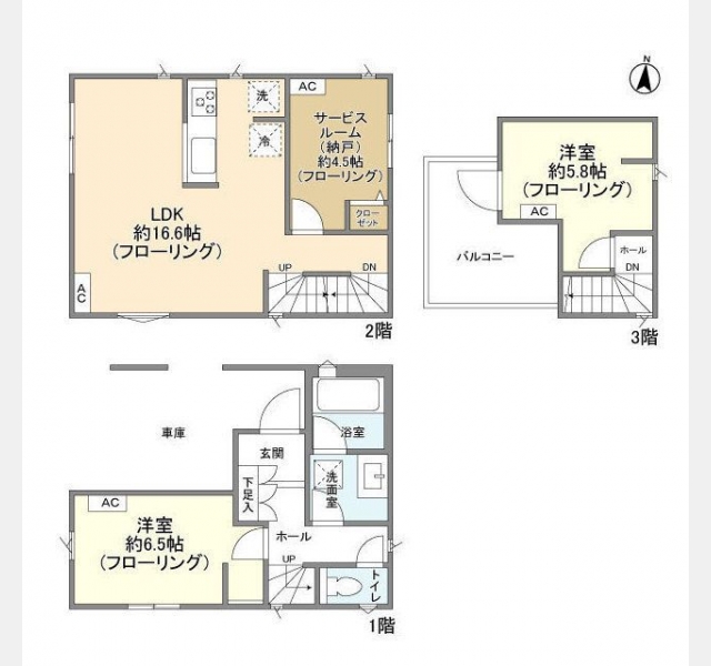 洋室 6.5 畳 1 階 1 室 LDK 16.6 畳 2 階 1 室 S 4.5 畳 2 階 1 室 洋室 5.8 畳 3 階 1 室 |