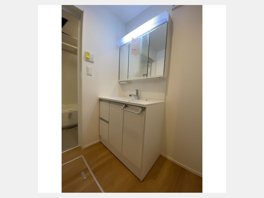 収納も可能な洗面化粧台が備え付けられています。共用部には宅配ボックスを設置しているため、家で何時間