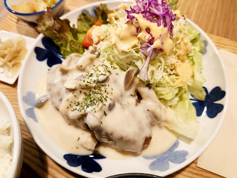ボリュームのあるハンバーグにやさしいキノコソース。